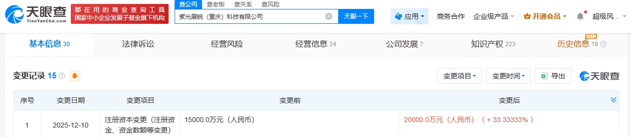 每经AI快讯,天眼查工商信息显示,近日,紫光展锐(重庆)科技有限公司发生工商变更,注册资本由1.5亿元人民币增至2亿元人民币,增幅约33%。该公司成立于2018年12月,法定代表人为任奇伟。股东信息显示,该公司由紫光展锐(上海)科技股份有限公司全资持股。