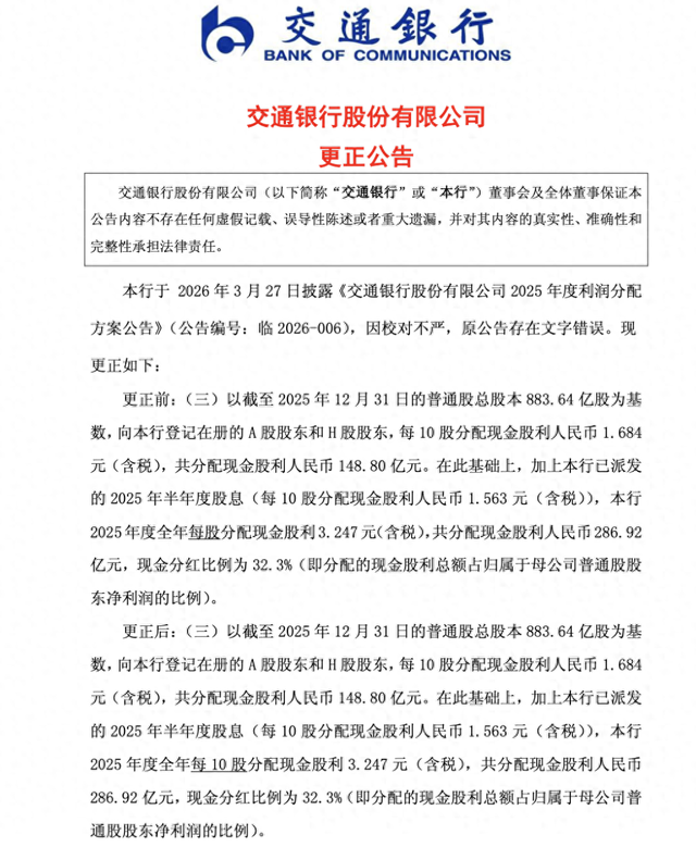 对比更正前后内容,交行在此前公告中将“本行2025年度全年每10股分配现金股利3.247元(含税)”误写成了“本行2025年度全年每股分配现金股利3.247元(含税)”,即把“每10股”误写成了“每股”。