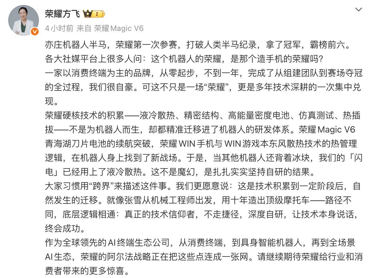 方飞在微博上解读荣耀人形机器人此次为何能取得不俗成绩