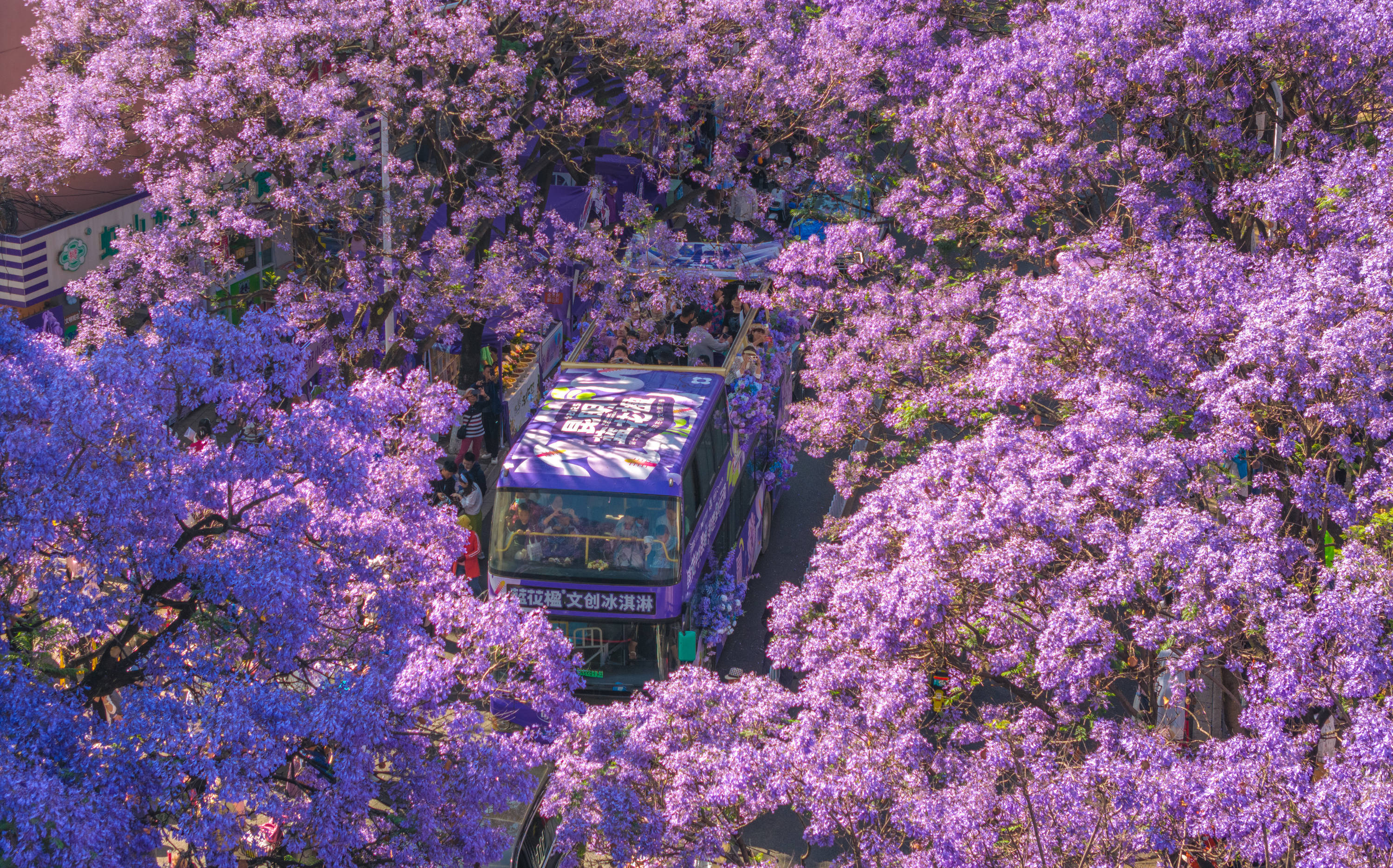 2025年5月5日,在云南省昆明市五华区教场中路,游客们乘坐蓝花楹主题观光巴士,欣赏蓝花楹盛开景色(无人机照片)。(宋光旭 摄)这一步一步走来的,不仅是品牌形象的变化,更折射出从观光旅游到停留旅居,再到旅居创业的深刻转变。